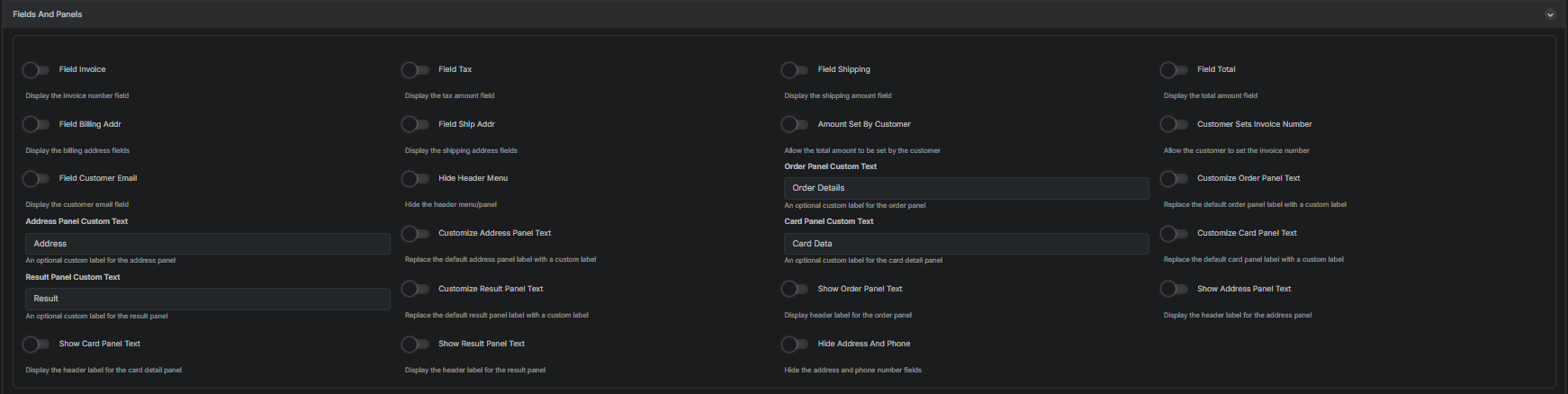 Choose which fields and panels should appear on the Hosted Payment Page.